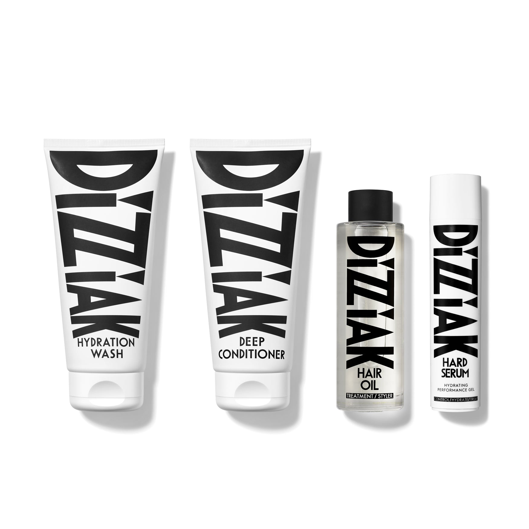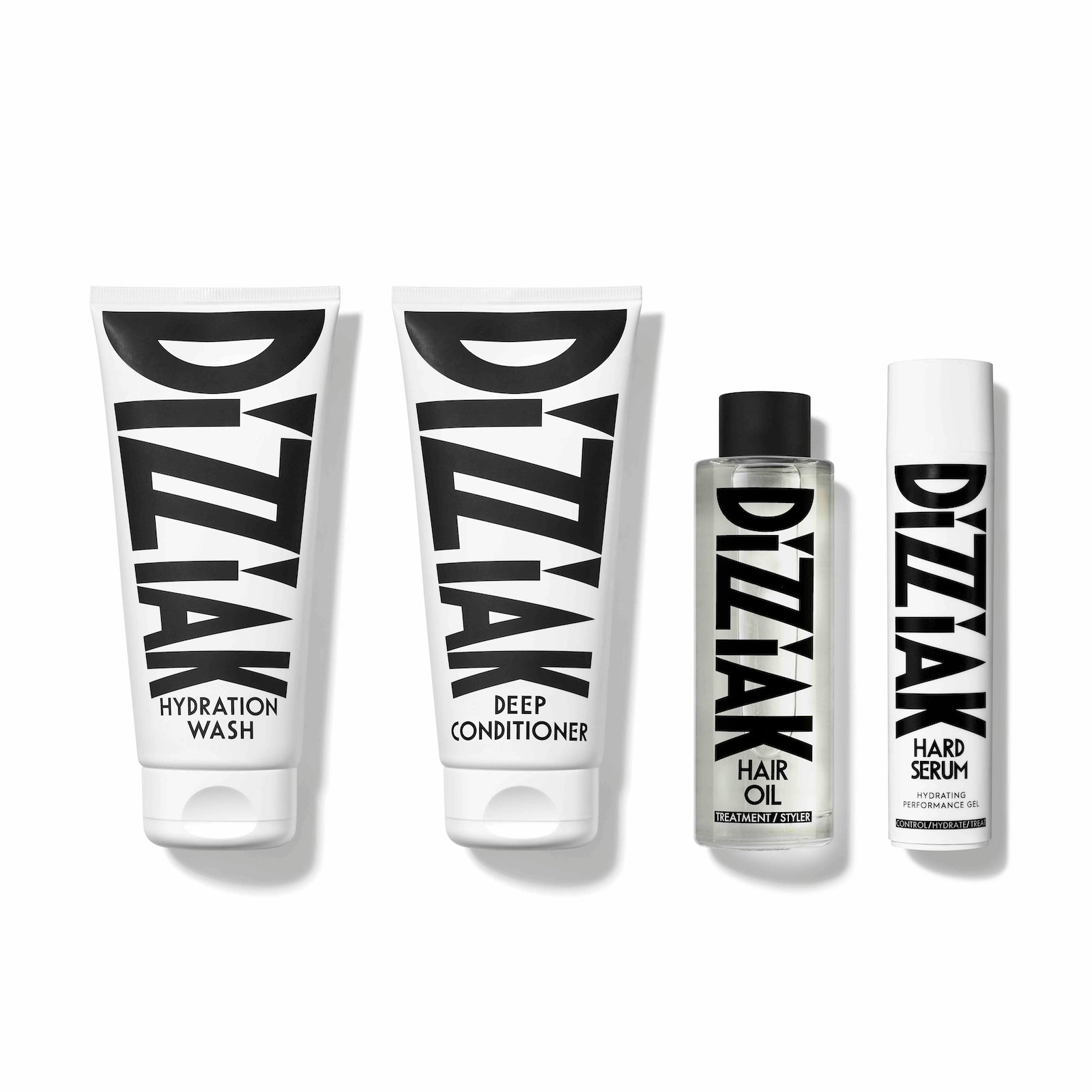 A: The full DIZZIAK routine including Hydration Wash, Deep Conditioner, Hair Oil 50ml and Hard Serum 50ml together. Wash. Condition. Treat. Style. A complete system built around serious hydration for dry hair.